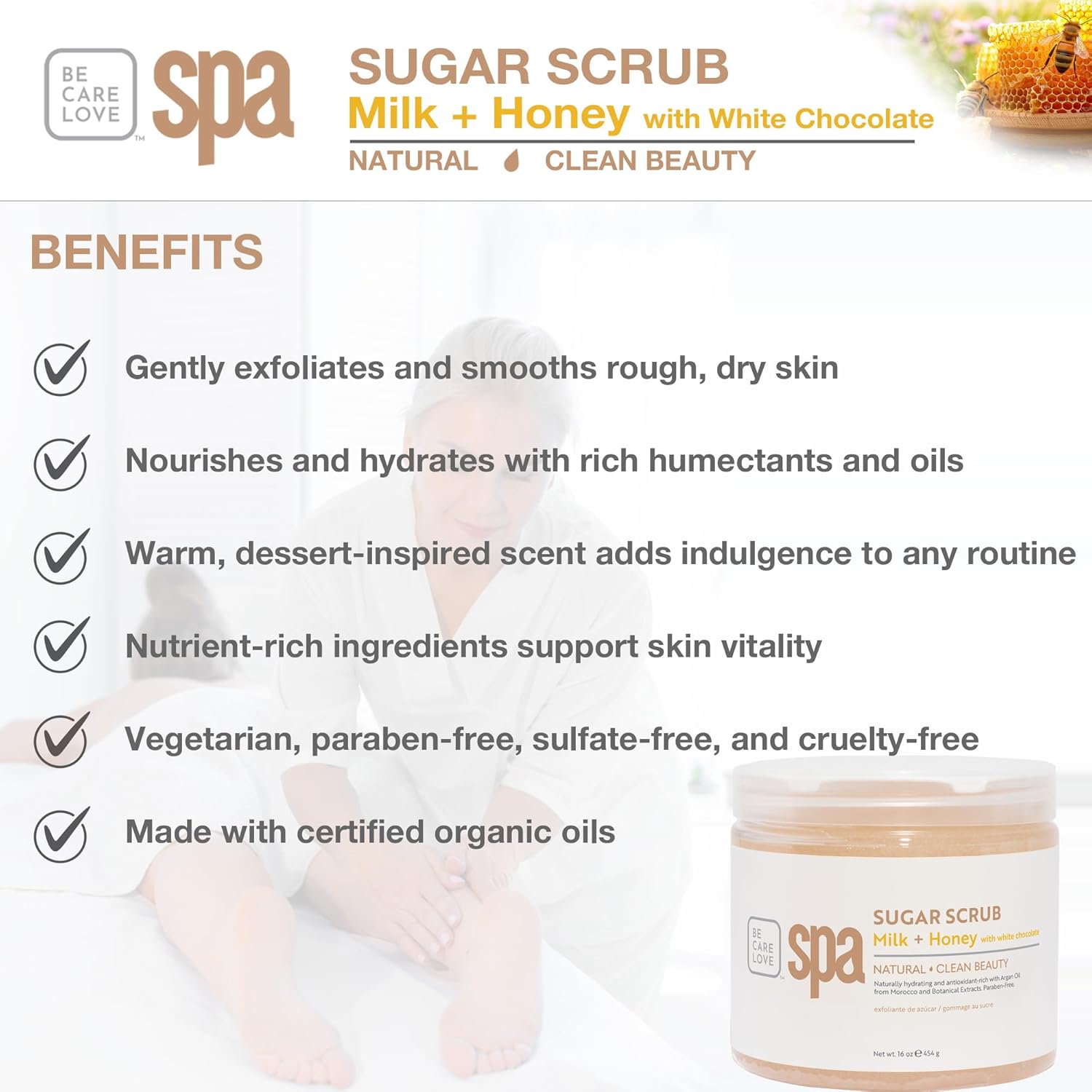 BCL SPA sugar scrub | organic Milk and Honey with White Chocolate exfoliating body scrub removes dead, dry skin for a soft & hydrated feel, nourishing essential body care 16 oz