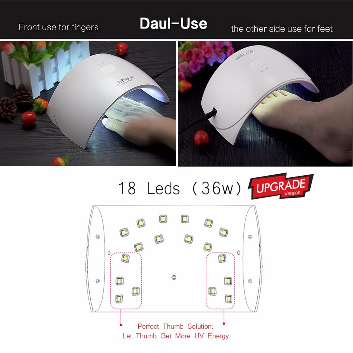 - 36W SUN9C Plus UV LED Lamp: Easily cure all kinds of UV/LED gel nail polishes, no brand limit. Just take about 30-60s to get a perfect finish, no harm to skin and eyes.