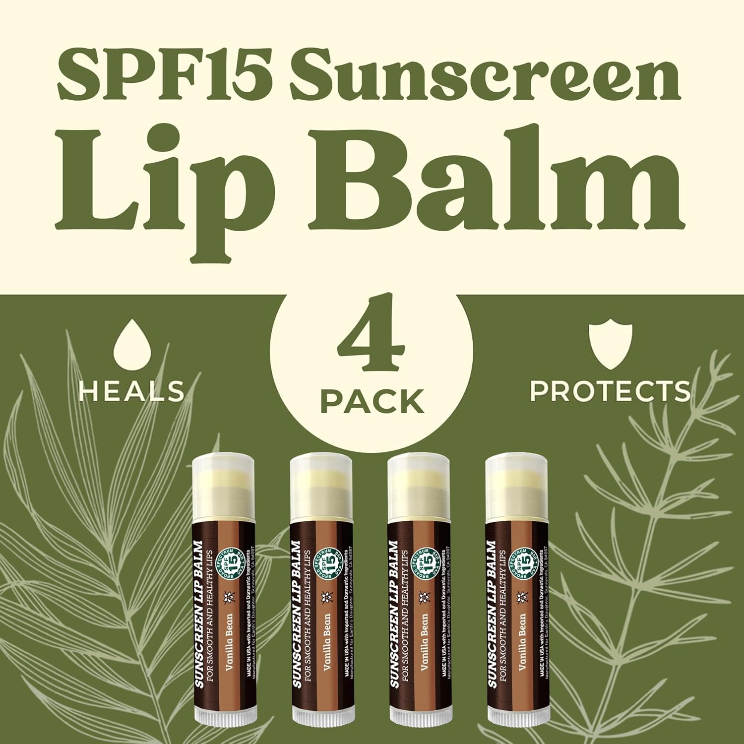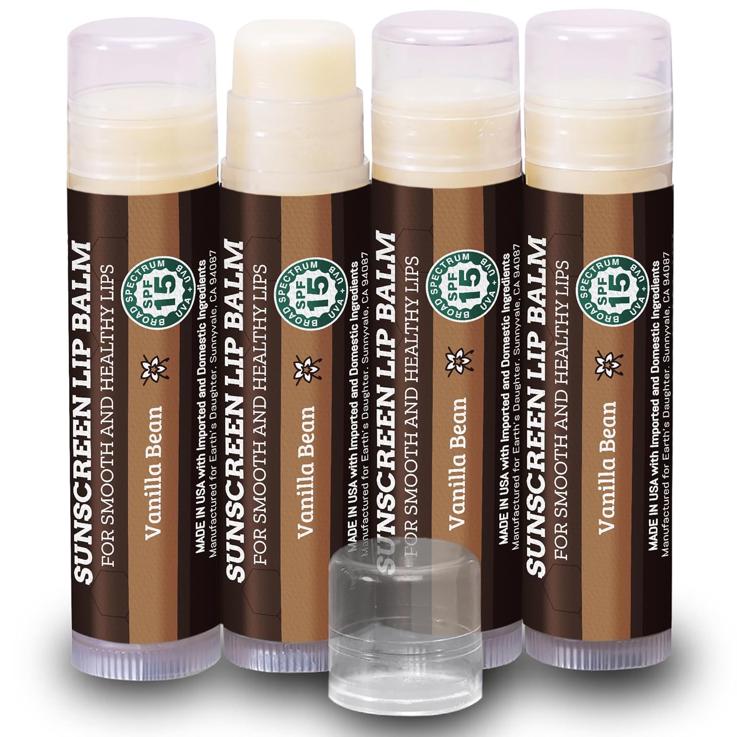 - 4 PACK of SPF 15 SUNSCREEN LIP BALM – Delicious Vanilla Flavor. Everyone loves our vanilla lip balm with SPF 15 sun protection, organic beeswax, organic coconut oil and other premium organic hydrating ingredients to protect and moisturize all day long. Our lip balm is great for everyday protection and safe for the whole family