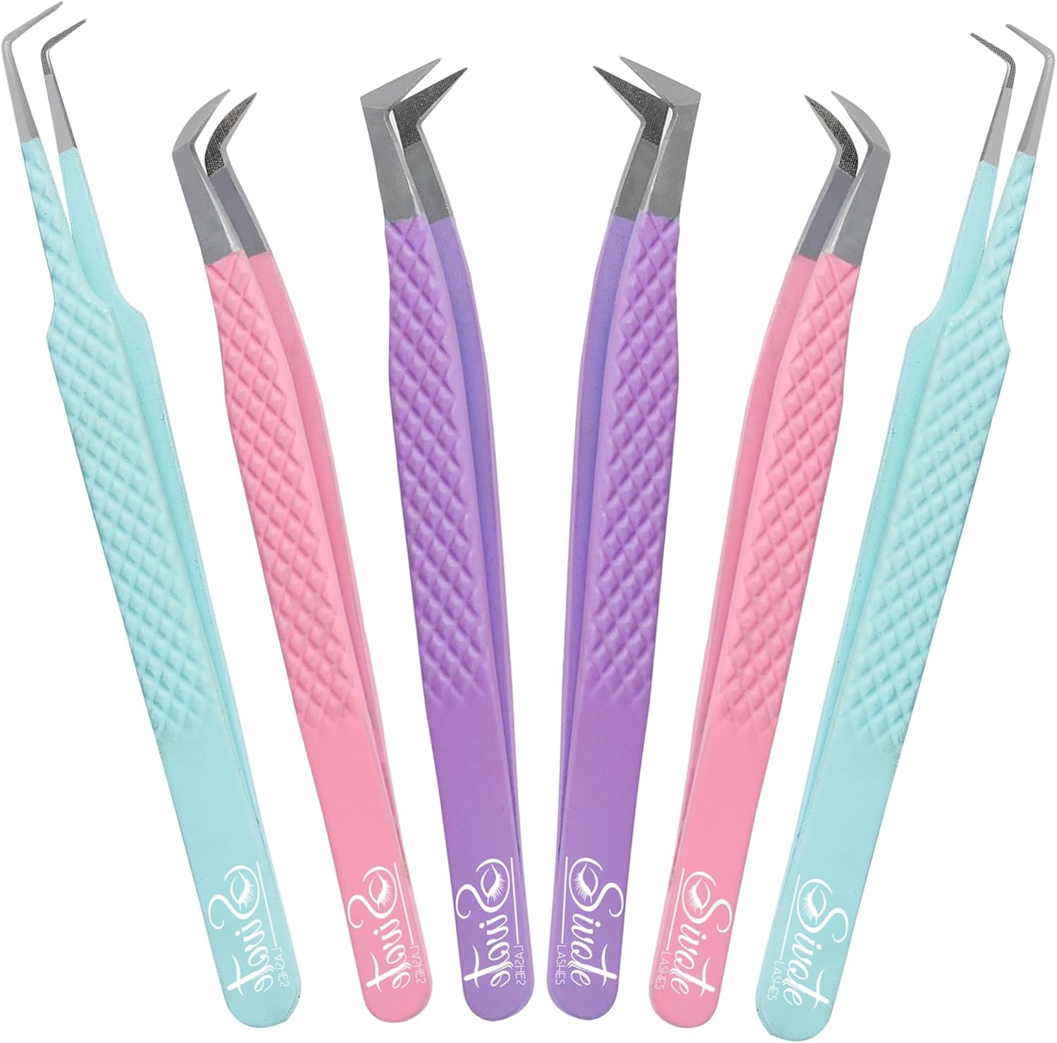 SIVOTE Lash Tweezers for Eyelash Extensions, Set of 6 - Volume, Volume Boot, Slim 90 Degree Tweezers with Fiber Tips in Pastel Colors, Ideal for Mega, Volume & Russian Lashes - Includes Leather Pouch