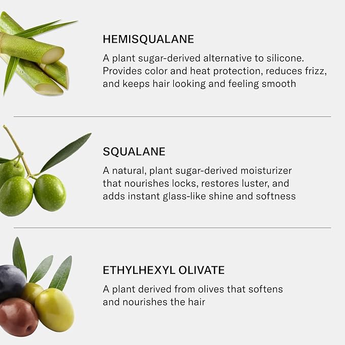 - Hero Ingredients: Hemisqualane (C13-15 Alkane): A plant sugar-derived alternative to silicone. Provides color and heat protection, reduces frizz, and keeps hair looking and feeling smooth Squalane: A natural, plant sugar-derived moisturizer that nourishes locks, restores luster, and adds instant glass-like shine and softness Ethylhexyl Olivate: A plant derived from olives that softens and nourishes the hair