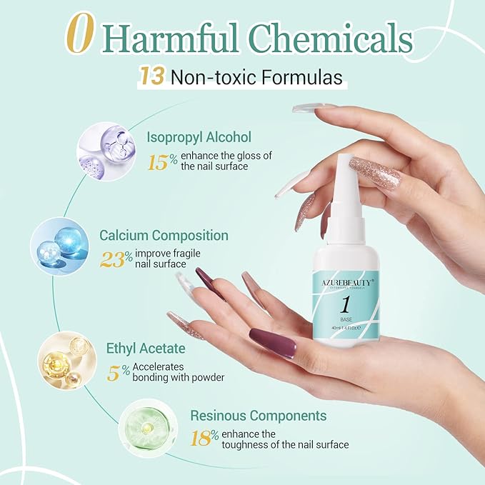 - ★ Long-Lasting and Easy to Use: AZUREBEAUTY dip powder base coat is anti-chipping, anti-peel off, breathable, does not damage the nail bed, doesn't need an LED nail lamp to cure, dries faster, and is skin-friendly. It can keep the nail art gorgeous and shiny for more than about 28 days if proper application
