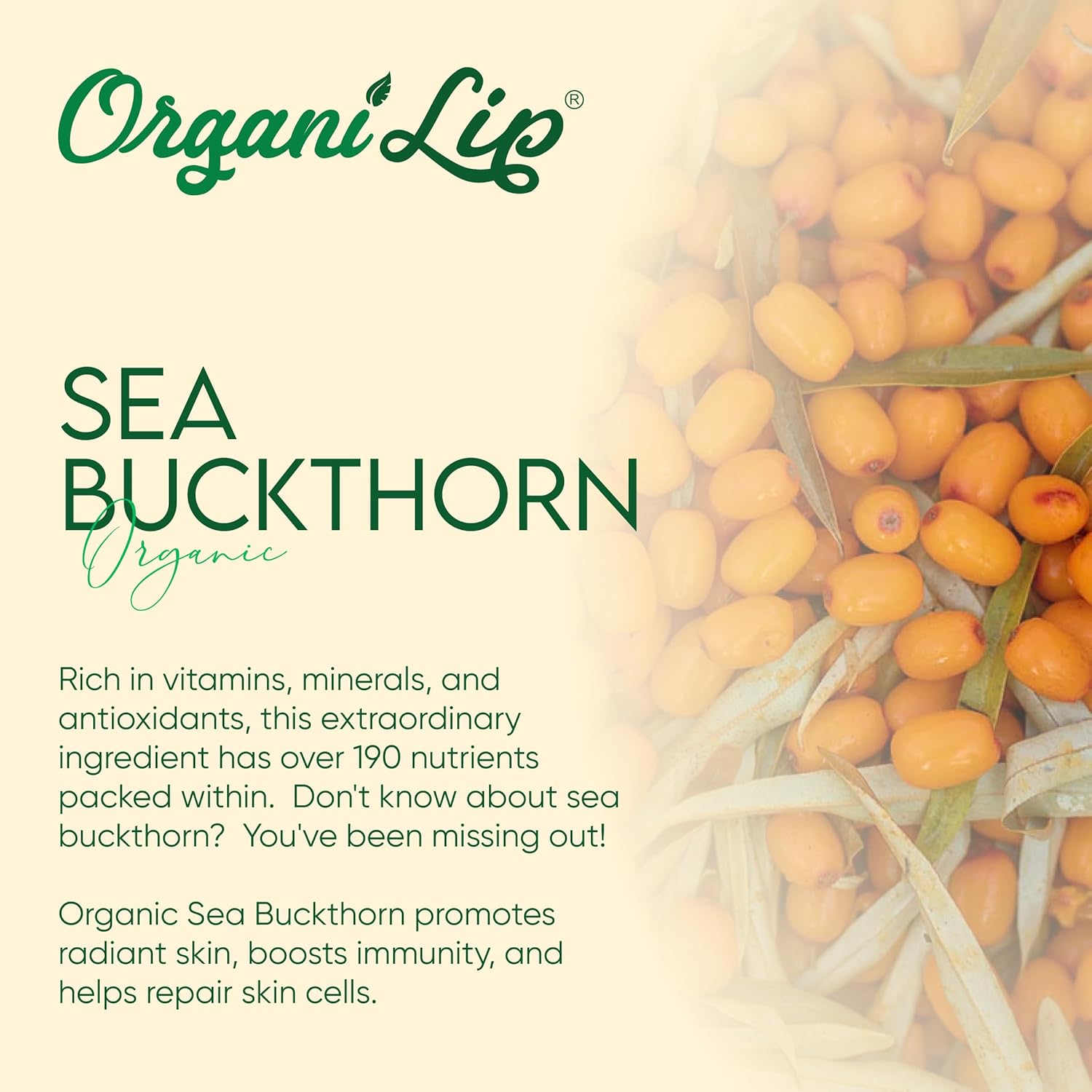 - WHY ORGANIC SEA BUCKTHORN? Sea Buckthorn Oil, derived from the sea buckthorn plant that grows high up in the Himalayas, has over 190 nutrients that promote skin health and contains high amounts of palmitoleic acid, which has skin repairing properties