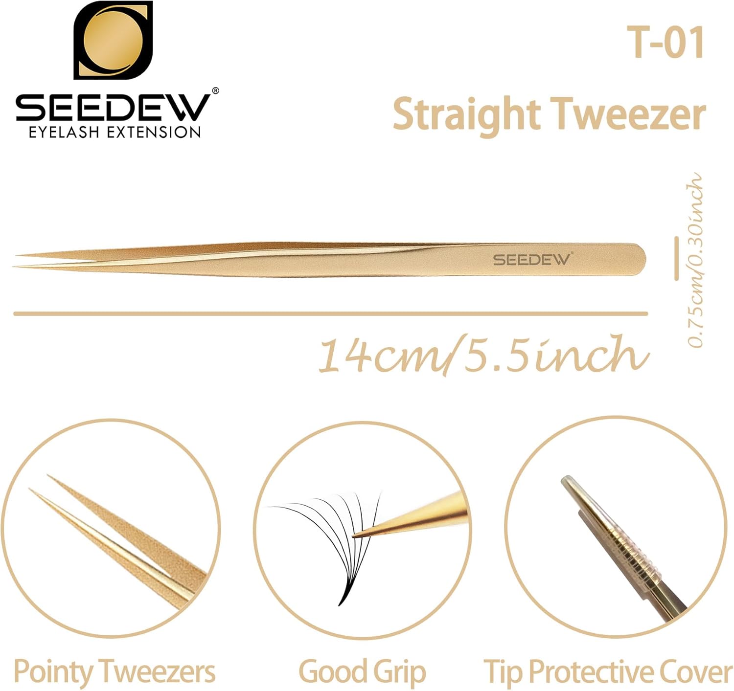 - ⭐【Premium And Classic】SEEDEW stainless steel golden tweezers have texture, smooth surface, classic and elegant style. 1 piece tweezer is equipped with a cover for the tip of the tweezer and a protective case, which is safe for storage, dustproof, dropproof, and imitation of poking.