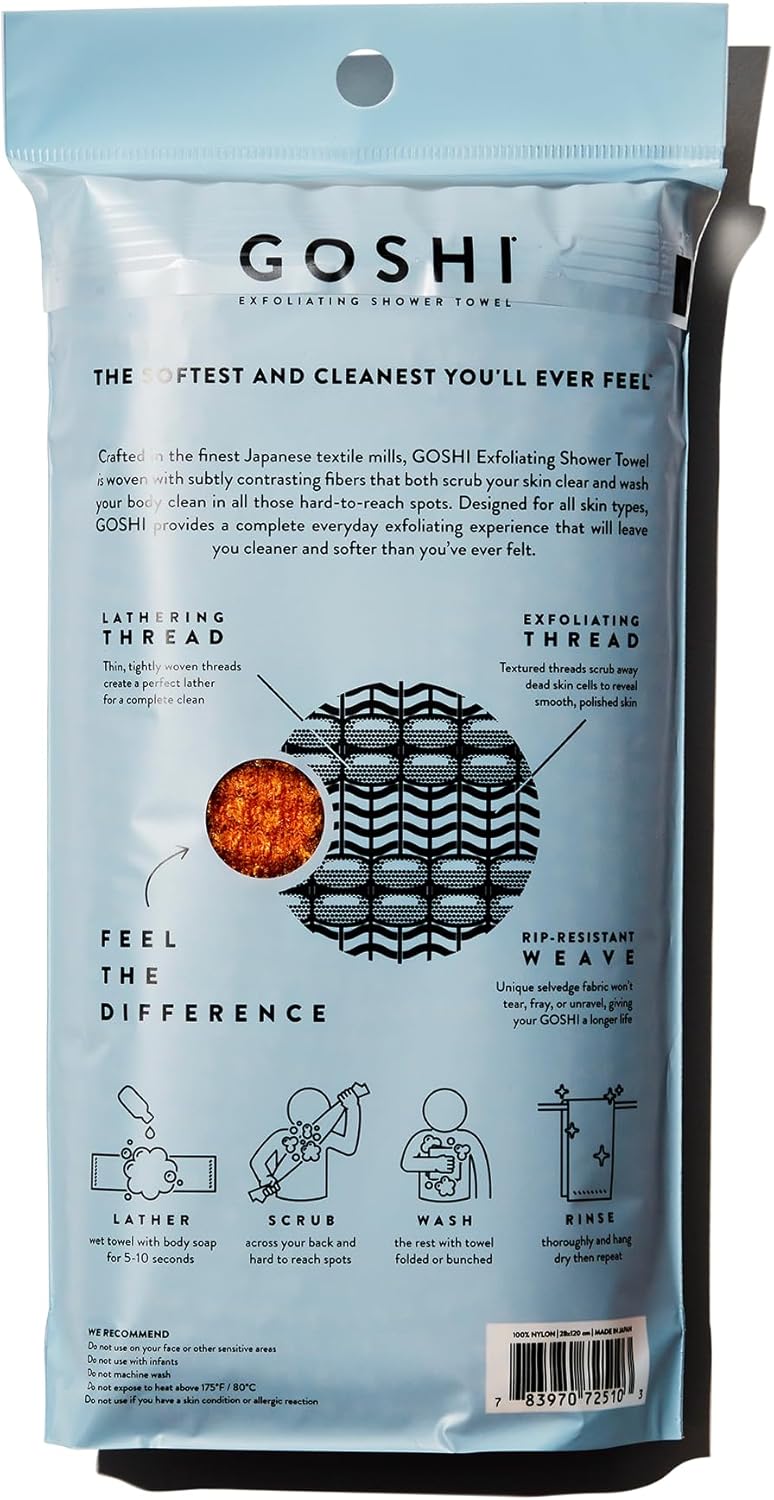 - Exfoliation Made Easy: Get ready to feel the softest and cleanest you’ve ever been. The GOSHI exfoliating towel is a game-changing Japanese shower towel and body scrubber exfoliator with more substantial surface area coverage, allowing you to clean hard-to-reach areas without the cumbersome parts that can ruin your entire shower experience. The perfect replacement for your loofah, glove, scrub brush, and even your old towel brand.