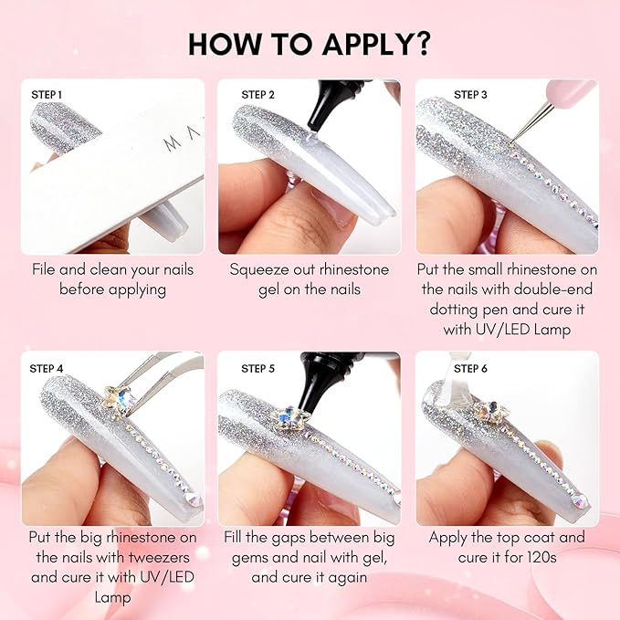 - How to Use: Apply crystal glue resin to your nail. Place rhinestones onto glue and cure for about 3 minutes using an LED lamp. For larger rhinestones, add more glue for extra security. Cure until fully dry, and your nail charms are beautifully secured