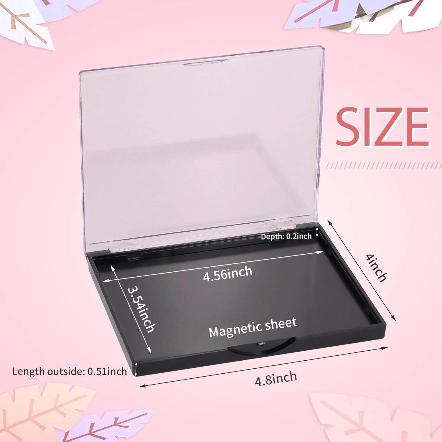 - Magnetic Makeup Palette: Length Outside: 4.8inch,Width Outside: 4inch, Depth Outside: 0.51inch; Length Inside: 4.56inch ,Width Inside: 3.54inch, Depth Inside: 0.2inch, which can storage 12pcs 1 inch diameter eyeshadow. 1mm thickness magnetic sheet provides strong enough magnetism to ensure that your cosmetics pan won't slide around or fall out.