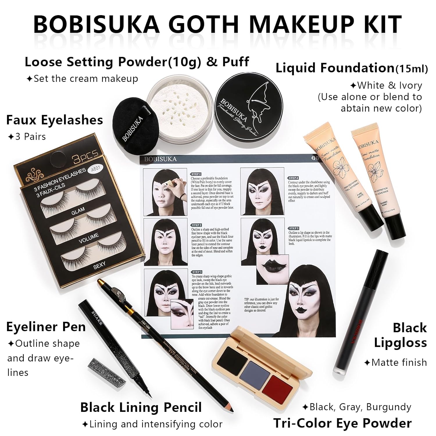 - BOBISUKA HALLOWEEN ALL-IN-ONE GOTH MAKEUP KIT contains all professional makeup needed to achieve classic goth makeup looks: 2 Liquid Foundation(goth white foundation & ivory foundation), Tri-Color Eyeshadow Powder(black, red & zombie grey), Faux Eyelashes(3 pairs), Black Slim Eyeliner, Black Liner Pencil, Black Liquid Lipstick, Setting Powder(10g) with Puff. The included step-by-step instruction will help you to create a classic goth look with ease and confidence!