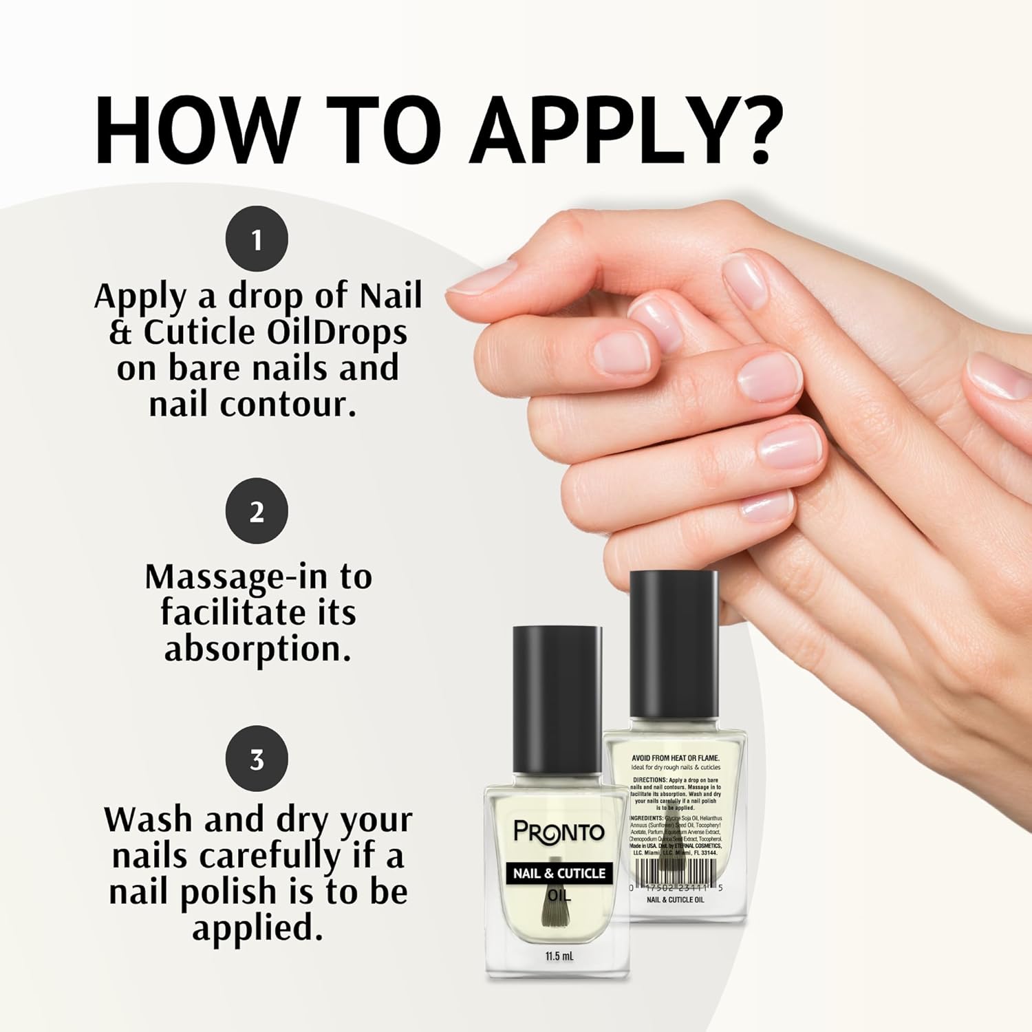 - PREMIUM QUALITY PRODUCT: Our Pronto fingernail polish remover & cuticle drop duo are proudly made in USA, using 100% pure acetone to effectively and efficiently remove all types of manicure and pedicure and cuticle oil to help deeply nourish and protect nails.