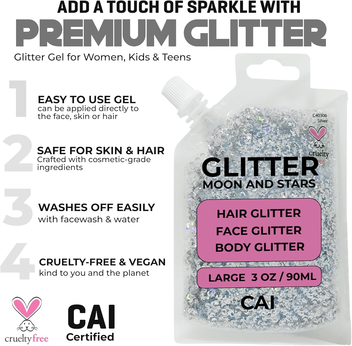 - Hair Glitter for Kids & Adults: Add sparkle to any look with this fun, easy-to-use hair glitter gel for kids and adults. The chunky, iridescent formula glides onto strands effortlessly and rinses out without mess. Perfect for Halloween hair glitter, costumes, or daily glam.