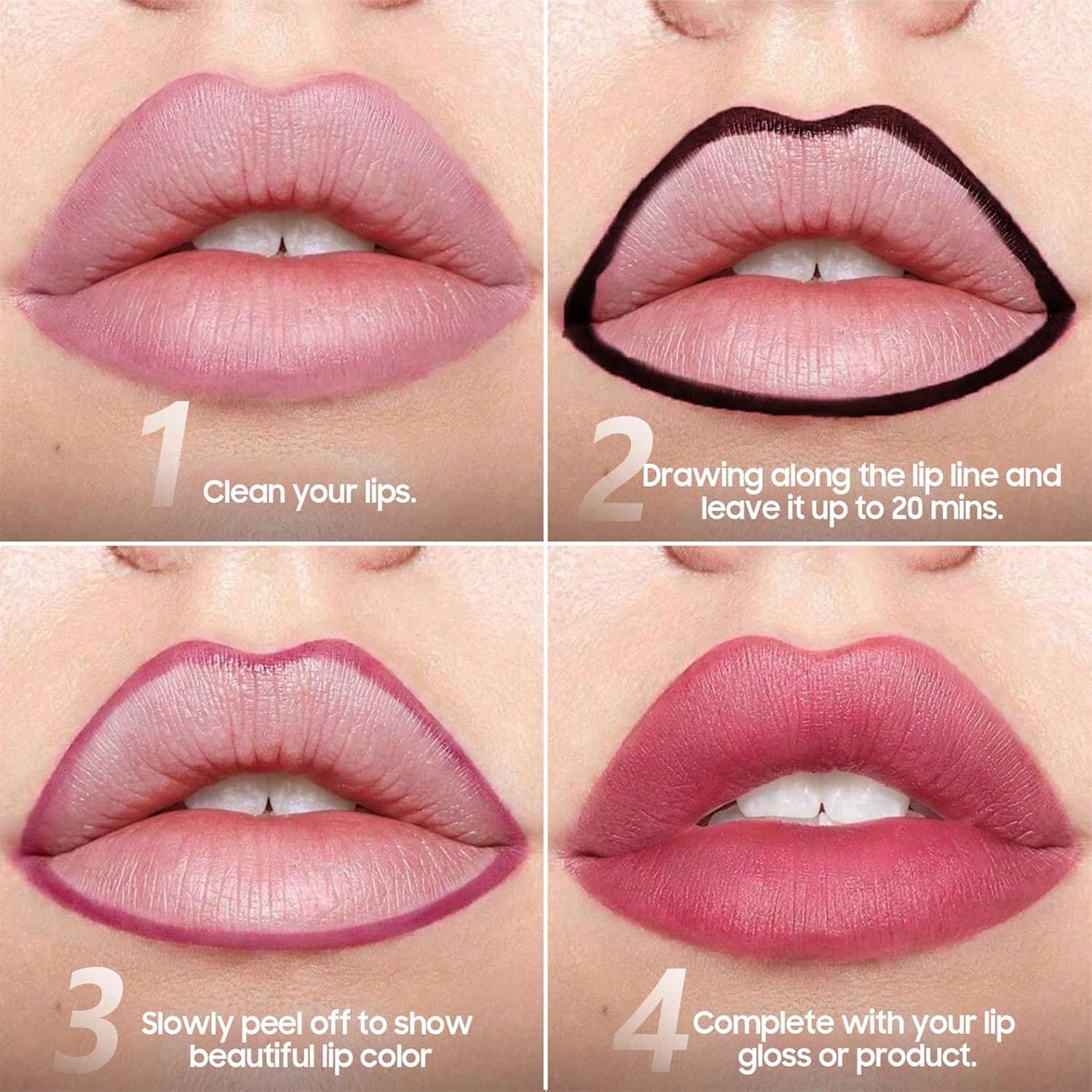- 【Easy to Use】: First of all, you need to clean your lips, and apply lip balm or other lip products to make your lips smooth (do not use on chapped lips) before using it. Second, start drawing along the lip line and just leave it up to 20 mins. Finally, slowly peel off with your fingers to show beautiful lip color, then complete with your favorite lip gloss or product.