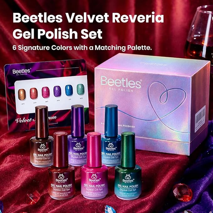 - 【Velvet Reveria Cat Eye Gel Polish Set】Beetle Special 15ML Generous Bottle Size "Velvet Reveria Collection" gel nail polish set! Perfect choice for beginners and professional nail technicians. 6 fantastic inters tellar colors of cat eye gel polish to create galactic colors on your nails - Red, Shiny Brown, Burgundy, Purple, Blue, Green.