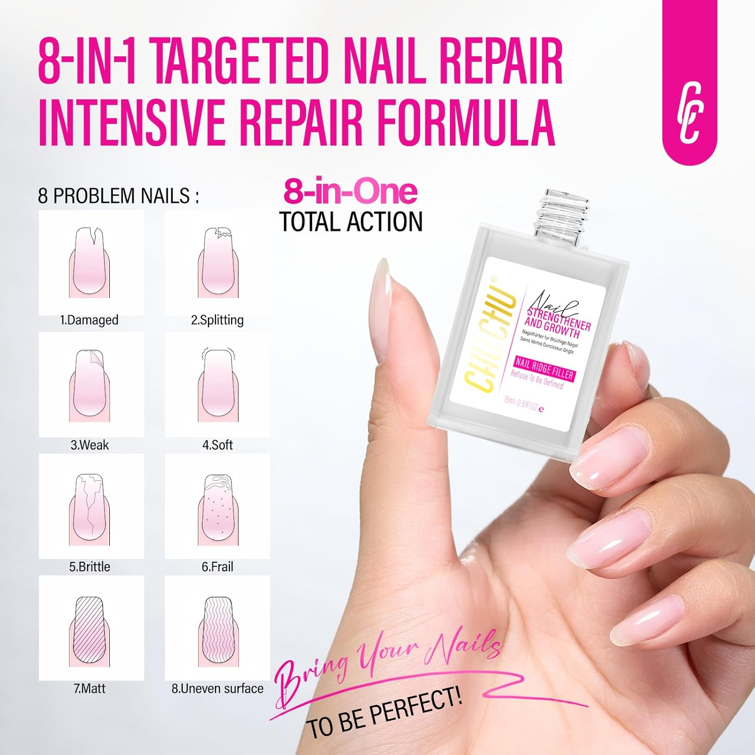 CHUCHU Nail Strengthener Base Coat: Quick Dry Protein Clear Hardener Polish - Repair Ridge Filler for Women Men Beginners Home Salon Gift - 15ML