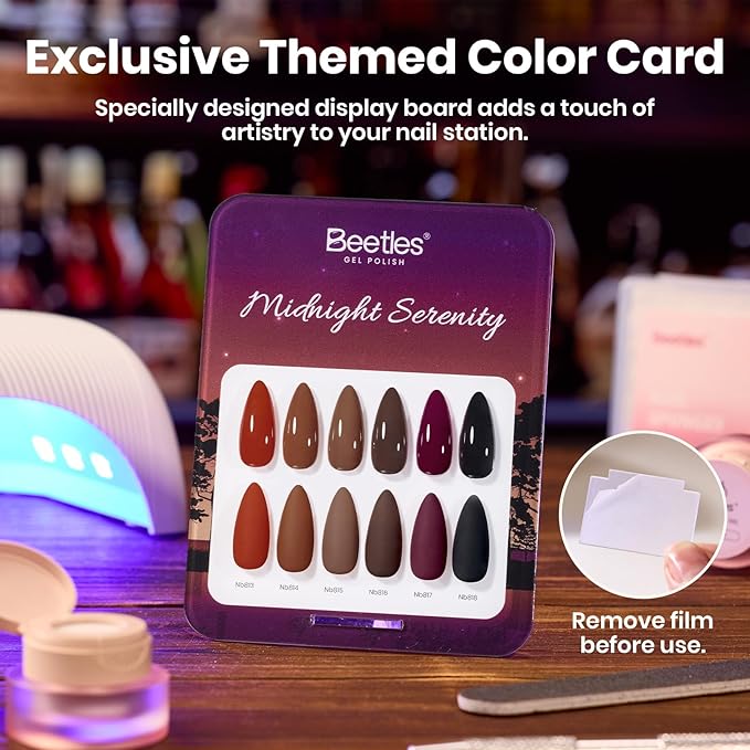 - Beetles Midnight Serenity Gel Polish Set Inspired Shades:Inspired by the quiet charm of a midnight café—warm lights, mocha air, leather textures, and deep alluring tones. This 6-color gel polish set captures a cool-yet-cozy aesthetic with rich mocha brown, berry wine, espresso plum, and muted noir hues that glow beautifully under low light. Perfect for fall, winter, and anyone who loves dark feminine elegance.