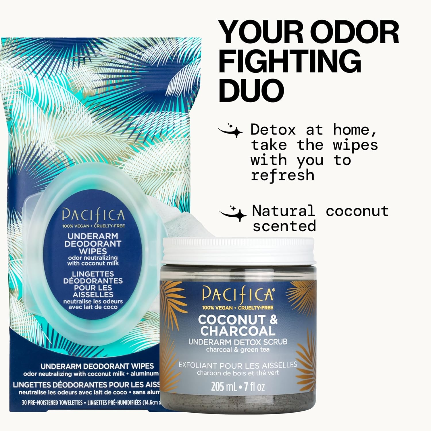 - SKIN-FRIENDLY FORMULA – Both products are free of aluminum, baking soda, parabens and phthalates that can irritate sensitive underarm skin. The coconut charcoal scrub uses clean, vegan ingredients – no harsh chemicals – so you can detox delicate skin without redness or stinging. The deodorant wipes are alcohol-free and enriched with aloe vera to soothe and condition, leaving underarms soft (never stripped or sticky). 100% vegan and cruelty-free, like all Pacifica products.