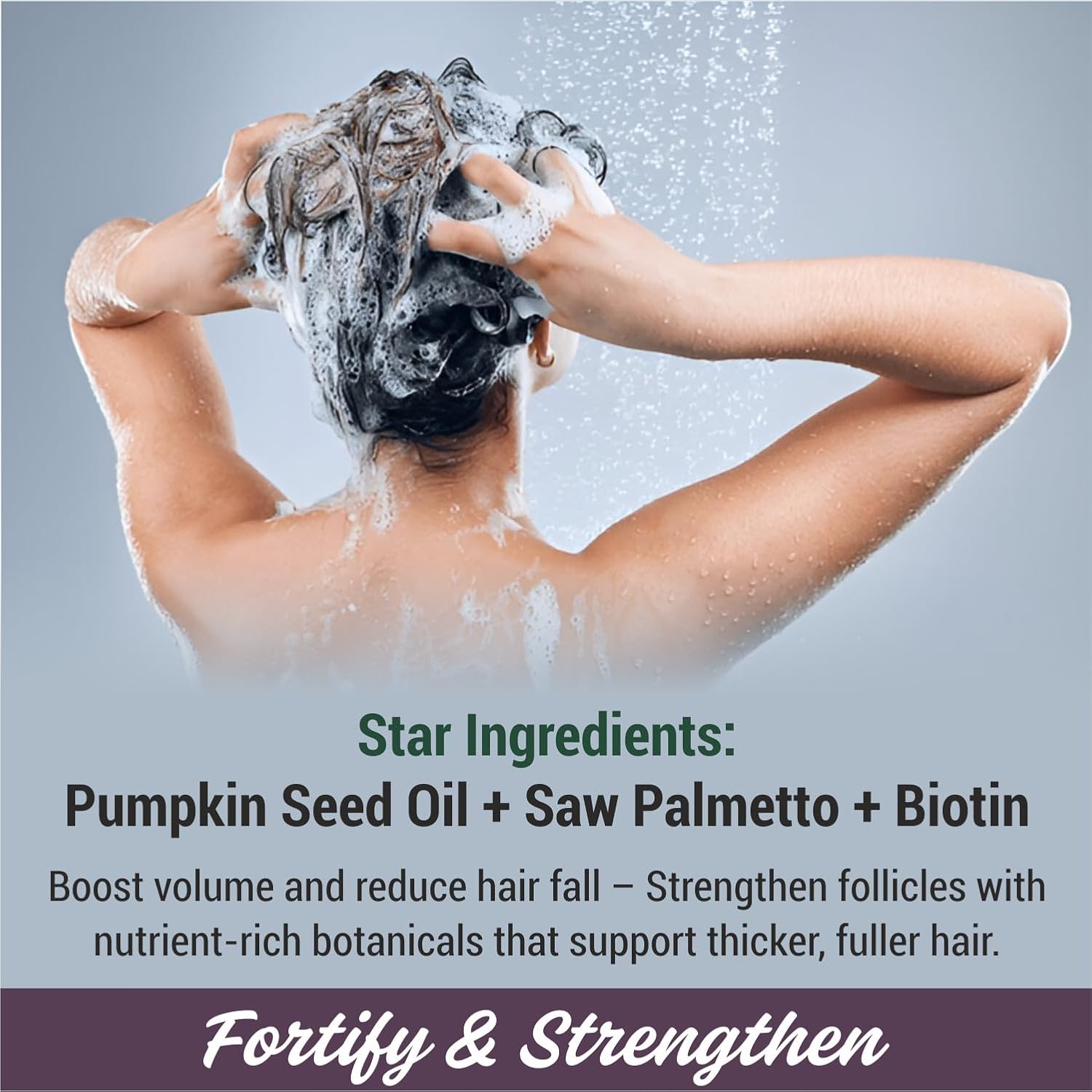 - Botanical Shampoo with Biotin, Pumpkin Seed Oil & Saw Palmetto This plant-powered shampoo features a thoughtful blend of biotin, saw palmetto, and pumpkin seed oil, designed to support the appearance of stronger, fuller-looking hair. Ideal for daily use, it leaves your hair feeling refreshed and nourished. Suitable for all hair types and textures.