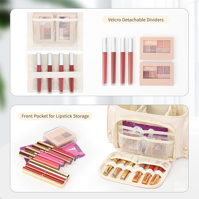 - Separate Makeup Brush Compartments - The makeup bag organizer top lid features a makeup brush compartment for multiple makeup brushes of different sizes, extra velcro PVC cover to protects the organization from powder dust and easy to clean make-up stains!